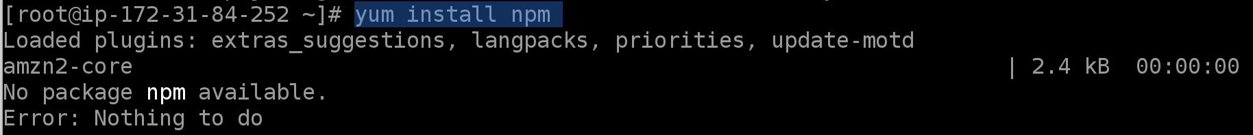 # yum install npm Loaded plugins: priorities, update-motd, upgrade-helper No package npm available. Error: Nothing to do