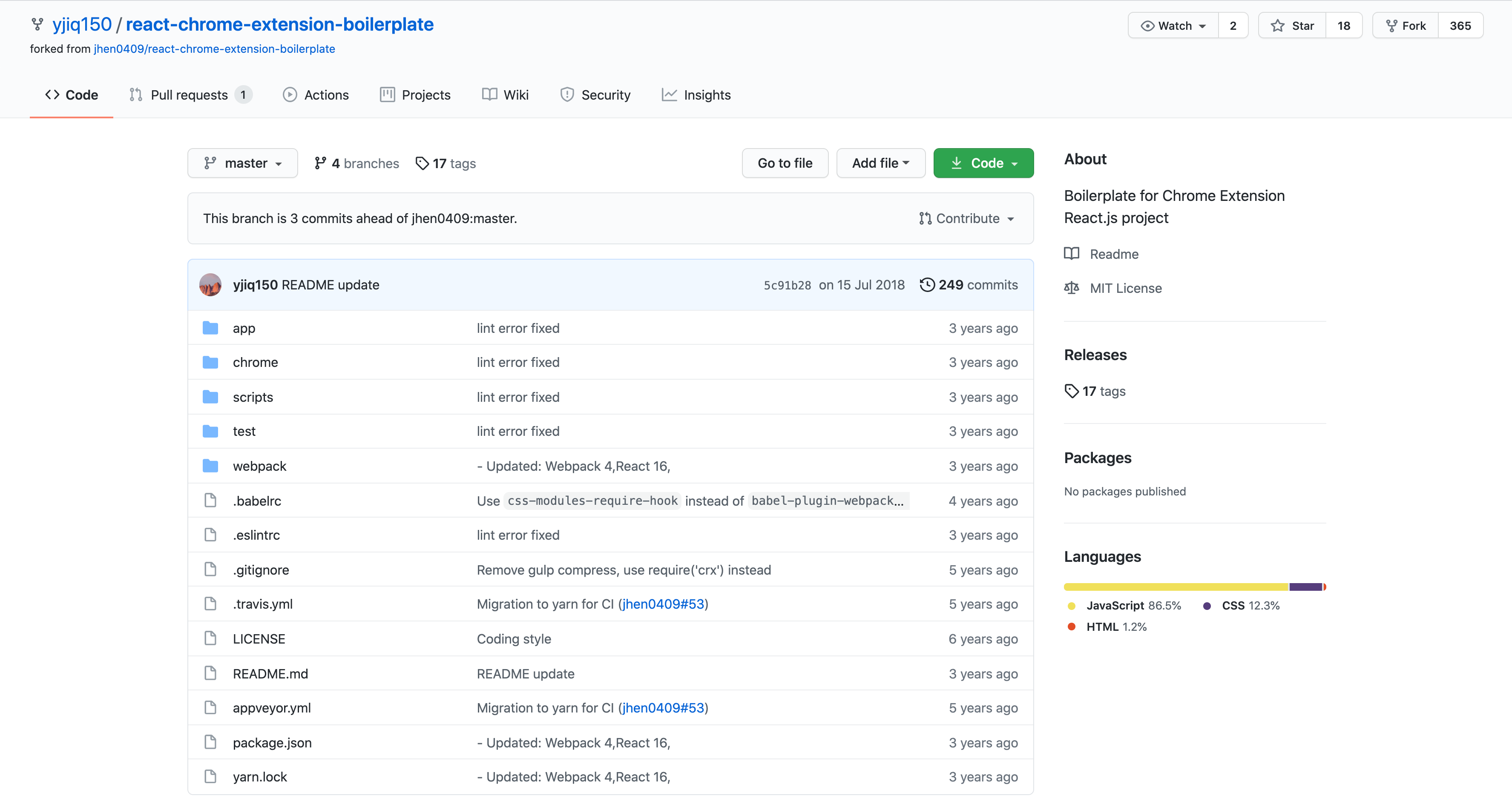 fork한 레포지토리의 경우 Webpack3, React 15로 구성되어있고 page context에 script를 inject 하는것이 불가능한 https://github.com/jhen0409/react-chrome-extension-boilerplate 이 레포지토리를 기반으로 제작된 보일러 플레이트로 Webpack 4, React 16으로 업데이트하고, page context script inject를 지원하도록 개발환경을 변경해 둔 버전이라고 할 수 있습니다.