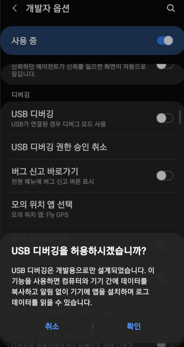 2. 설정 > 개발자 옵션 에서 USB 디버깅 사용 설정