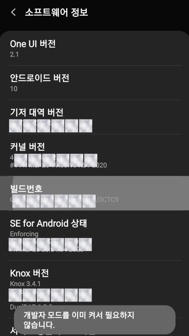 1. 설정 > 휴대전화 정보 > 소프트웨어 정보 > 빌드번호 빠르게 여러번 연속 클릭
