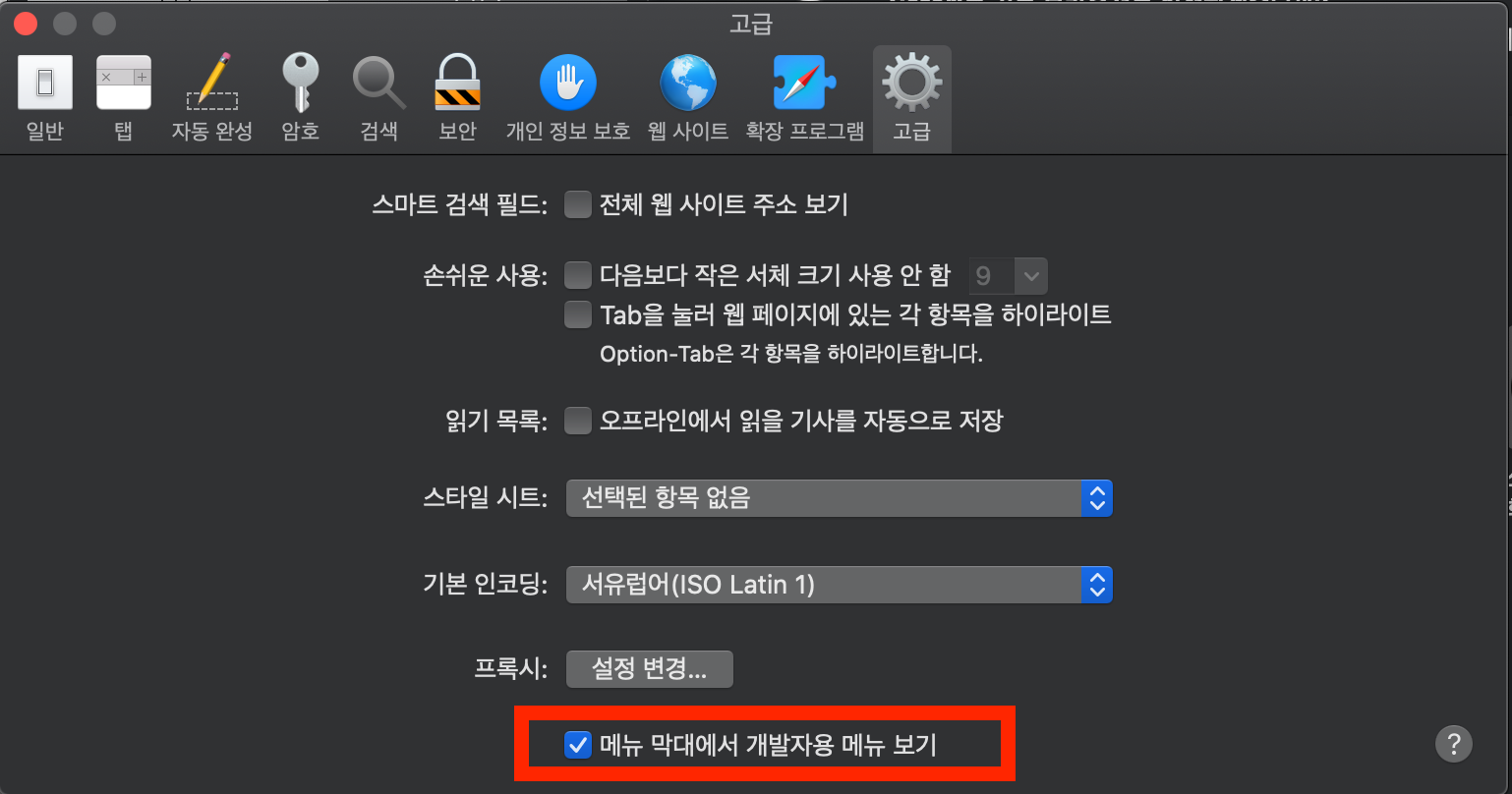 고급 탭의 "메뉴 막대에서 개발자용 메뉴 보기" 를 체크해 활성화 시켜줍니다.