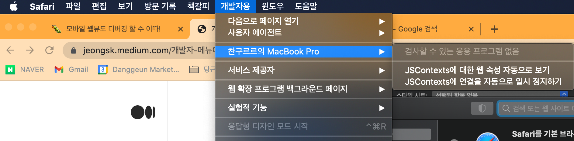 그러면 상단 메뉴에 "개발자용" 메뉴가 나타나게 되는데, iPhone 시뮬레이터 혹은 iPhone과의 usb연결이 정상적으로 진행되었을 경우 해당 메뉴에 기기의 이름이 나타나게 됩니다. 해당 메뉴를 통해 안드로이드+크롬 인스펙터 처럼 웹 디버깅을 할 수 있습니다.