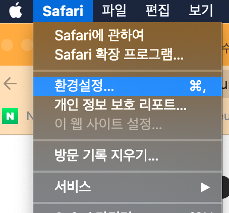 사파리를 켜고 좌측 상단의 safari 메뉴에서 환경설정을 클릭합니다.