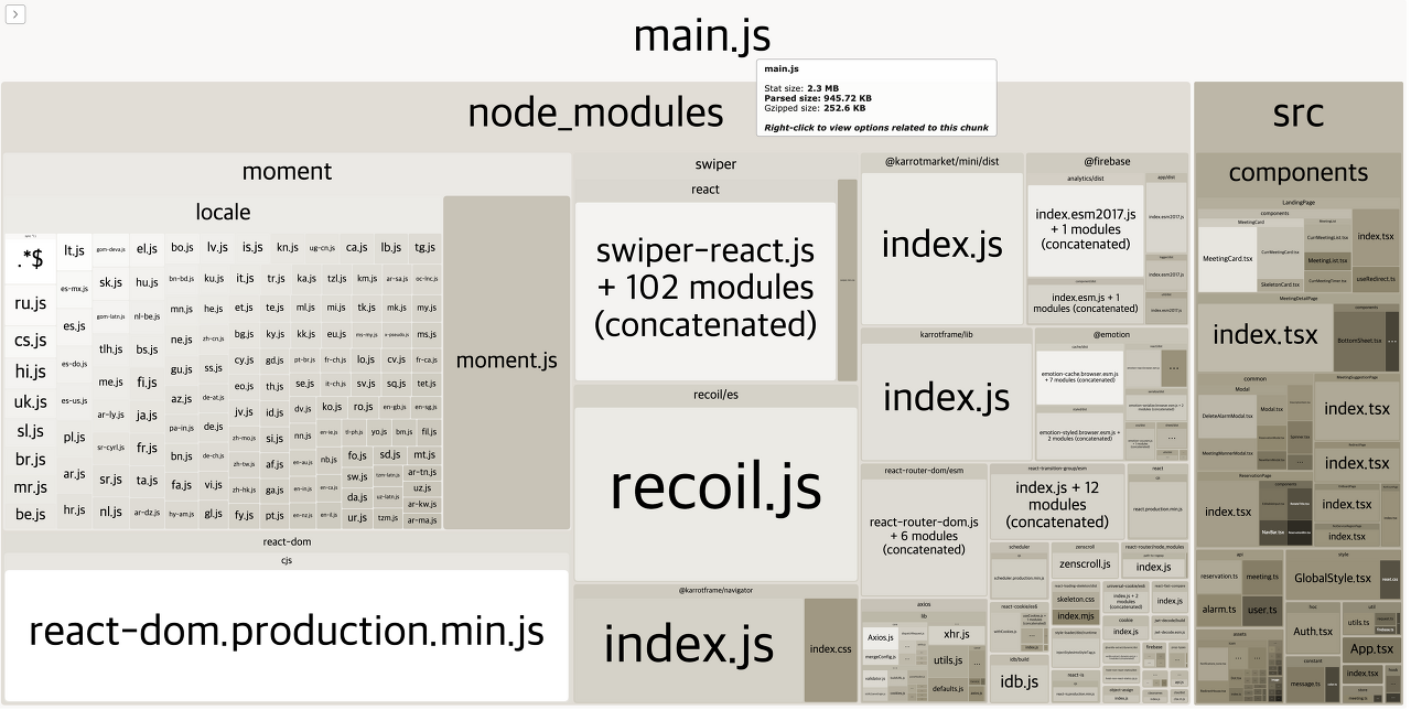 react-icons를 제거하고 나니 moment.js가 번들의 가장 큰 용량을 차지하고 있습니다.