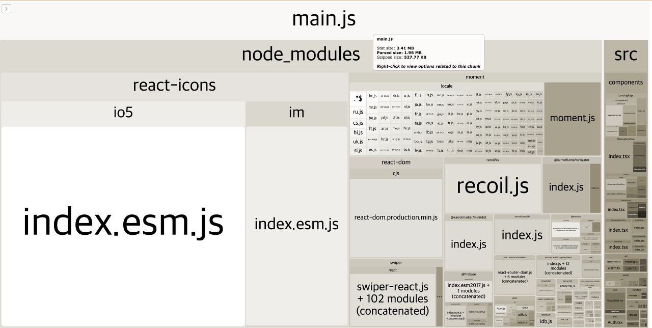 처음 main.js의 stat 사이즈는 3.41mb.. parsed는 1.96mb, gzipped는 527kb 이다.