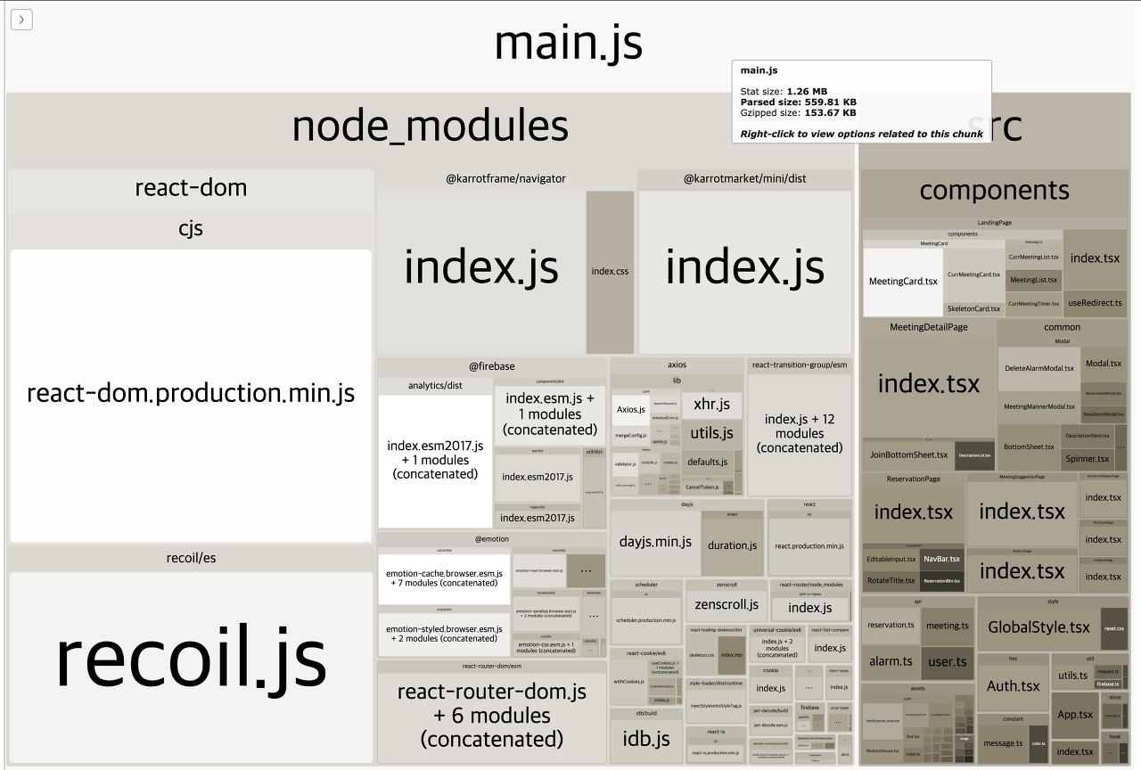 stat은 1.26mb, parsed는 559.81KB, gzipped 사이즈는 153.67KB로 줄었음을 알 수 있었습니다.