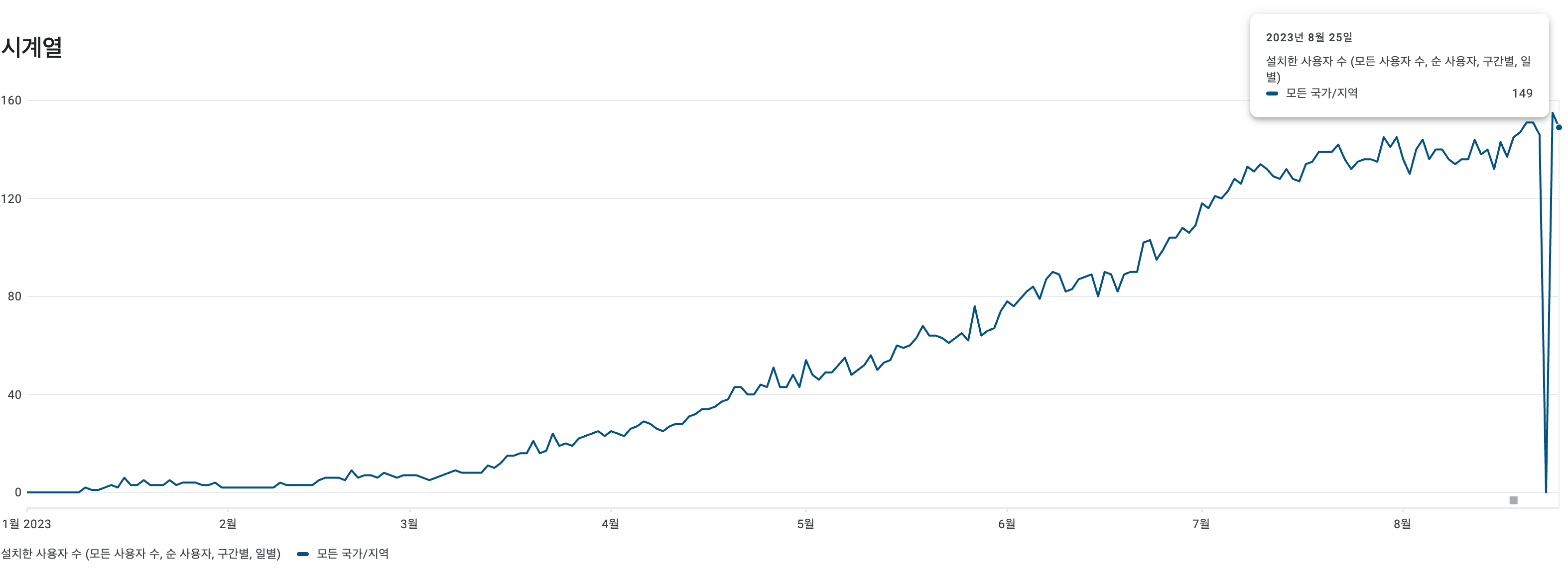 "사진 속 QR 코드 인식기"는 2022년 12월 31일 안드로이드 플레이스토어에 출시한 이후 작지만 꾸준히 총 설치 사용자수가 늘어났어요! 글을 작성하는 8월 말 현재 149명 정도의 다운로드 수를 유지하고 있는 상태에요.