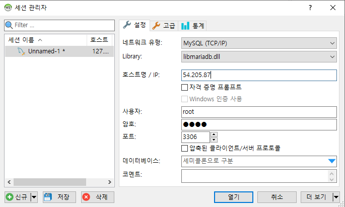 저 같은경우 아까 root 사용자와 1234로 만들었기 때문에 이대로 해서 열기를 눌러볼게요