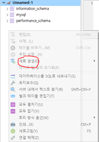 요렇게 새로생성 > 데이터 베이스 를 클릭해 주세요