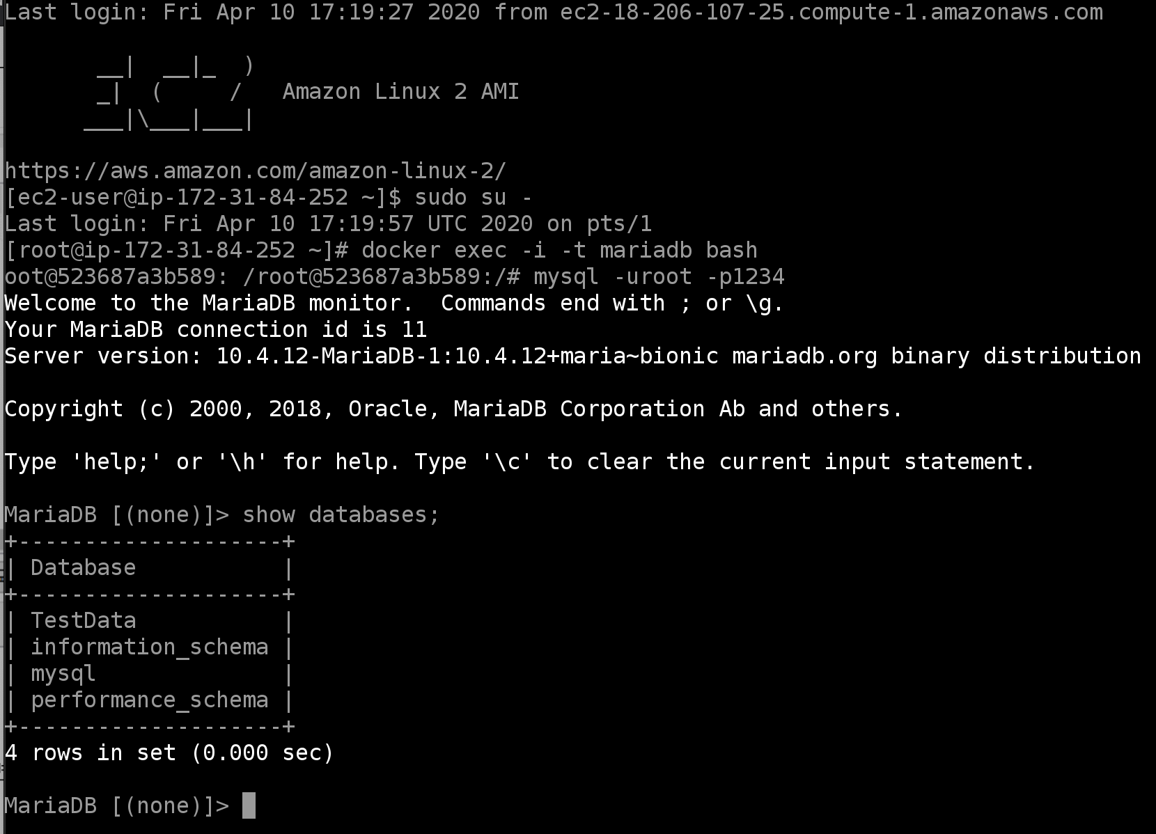 AWS EC2 에 docker 에 마리아db를 올리고 외부에서 접속해보는 실습을 마치겠습니다.