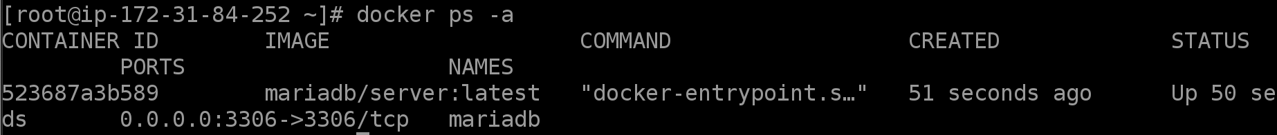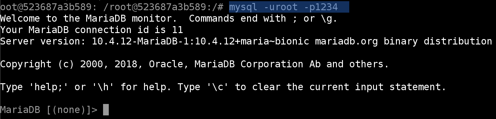 docker run --name mariadb -e MARIADB_ROOT_PASSWORD=1234 -p 3306:3306 -d mariadb/server:latest