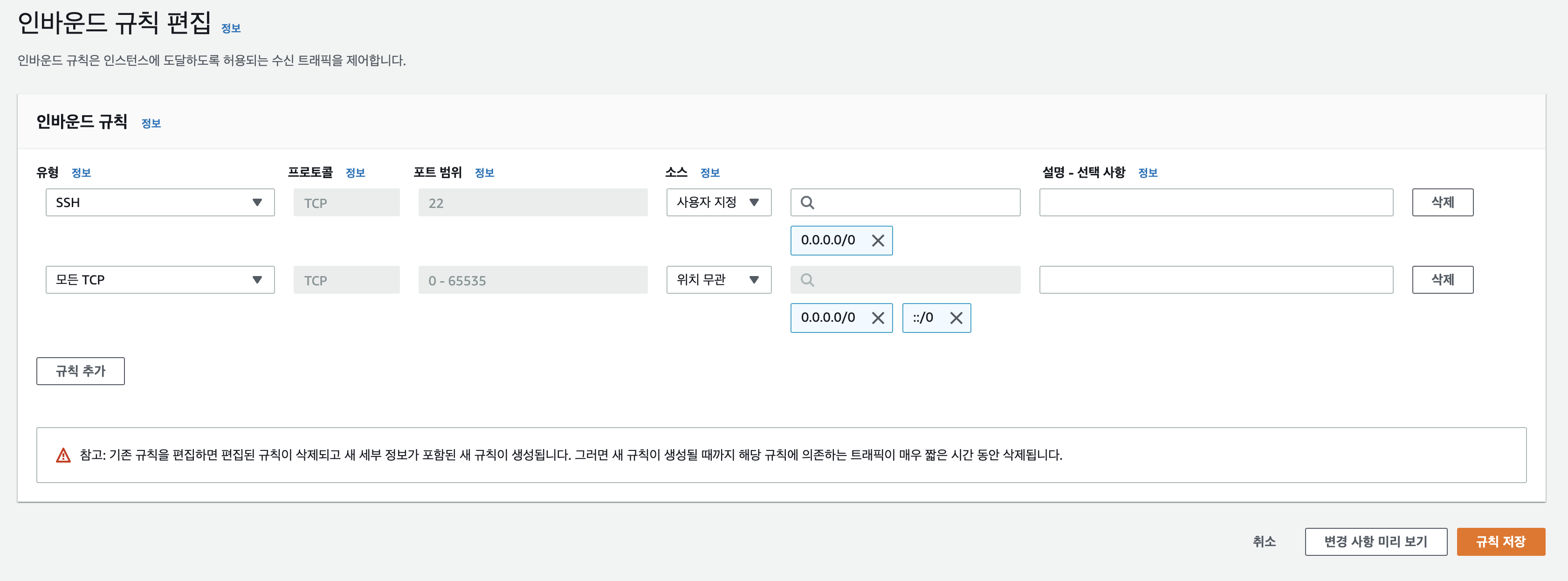 인바운드 규칙을 아래처럼 설정하고 저장해주면 됩니다.